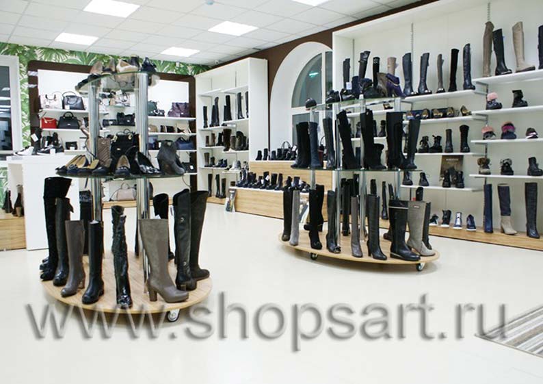 Очень удобна в применении торговая стойка вращающегося типа на колесиках. Она оснащается полками, на которых размещают обувную продукцию. Такие конструкции изготавливаются из качественного металла и отличаются устойчивостью. Для посетителей они удобны тем, что можно, вращая это торговое оборудование для обуви, увидеть за считанные секунды широкий ассортимент изделий. В зависимости от площади коммерческого помещения и разнообразия моделей потребуется приобрести две или три вращающиеся стойки.