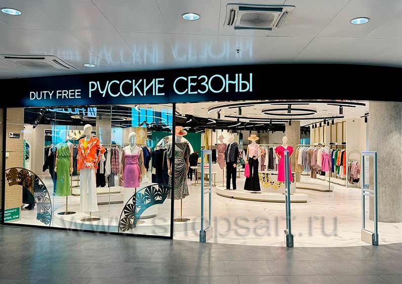 На этой странице Вы можете ознакомиться с фотографиями торгового оборудования в открытом магазине одежды DUTY FREE «РУССКИЕ СЕЗОНЫ», находящегося в зоне вылета международных рейсов аэропорта Пулково, Санкт-Петербург, на основе коллекции торговой мебели «ЗОЛОТАЯ ЛИНИЯ».