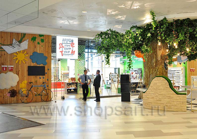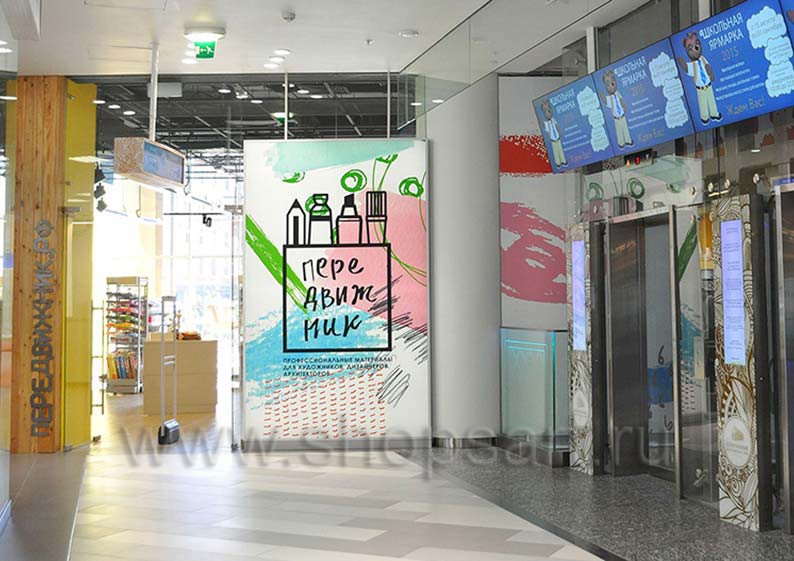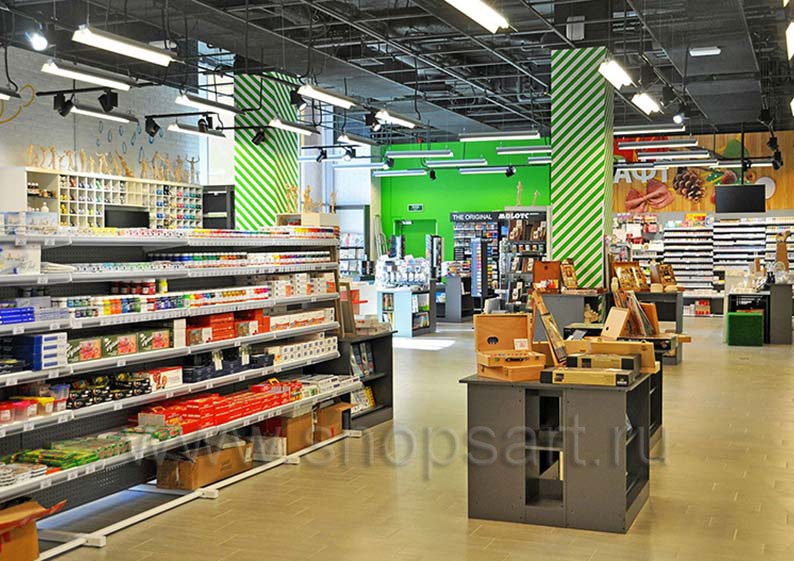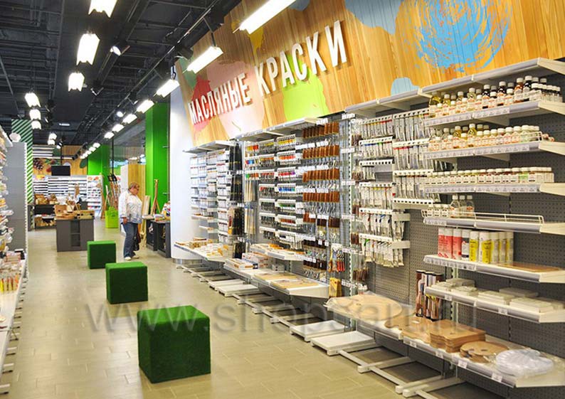 В качестве торгового оборудования магазина «Передвижник» были выбраны практичные и вместительные линии пристенных стеллажей, двухсторонние и четырехсторонние островные стеллажи, островные конструкции с радиусными полками. С учетом того, что в магазине представлено большое количество товаров разных групп, от красок и карандашей до книг и альбомов, мебель выбиралась с особой тщательностью. Учитывалось, что все товары должны быть в зоне доступа покупателей, поэтому некоторые отделы магазина оборудованы перфорированными стеллажами и стеллажами с дополнительными креплениями для вывешивания отдельных видов продукции.