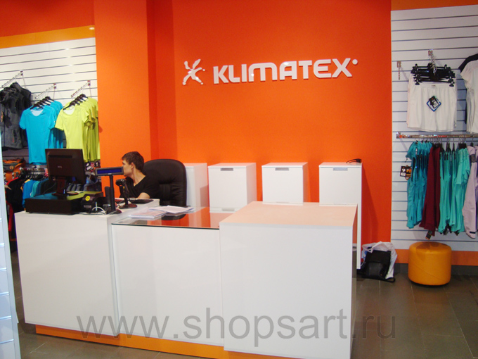 В функциональности и стильном дизайне этой мебели можно убедиться, посмотрев фотографии торгового оборудования магазина спортивной одежды KLIMATEX, коллекция АТЛАНТ.