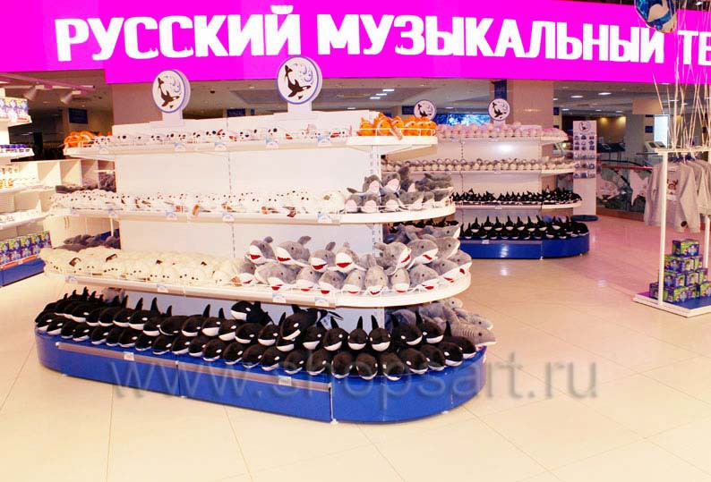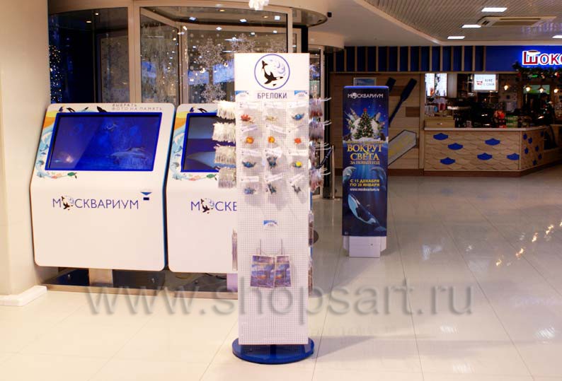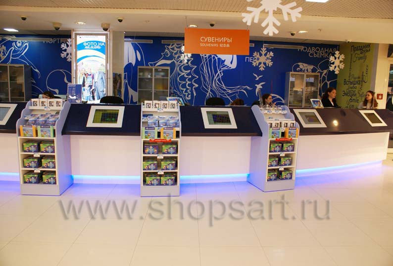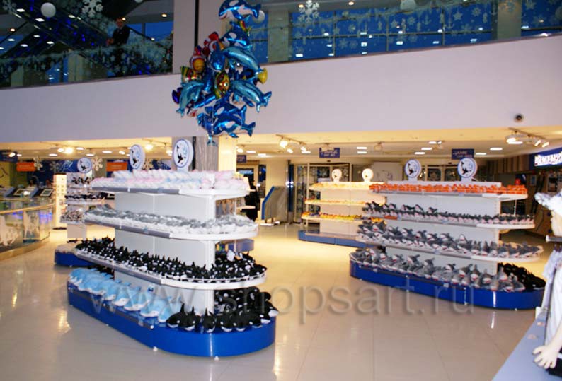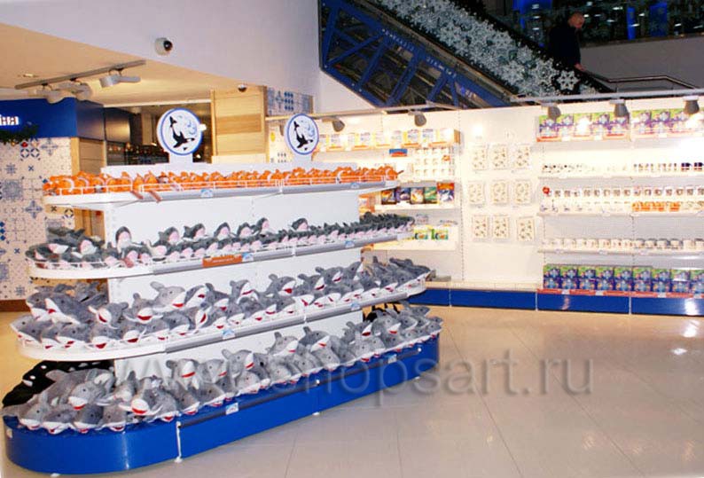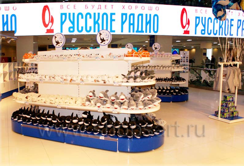 На этой странице Вы можете ознакомиться с фотографиями торгового оборудования в открытом магазине сувениров, находящегося в городе Москве, ВДНХ, проспект Мира, 119 стр.23, в научно-развлекательном комплексе океанариума и дельфинария Москвариум, в зоне входа-выхода, на основе коллекции торгового оборудования «БРЕНДИРОВАННЫЕ СТЕЛЛАЖИ». Разработала и поставила торговую мебель: торговые стеллажи, овальные стеллажи, пристенные стеллажи и другую торговую мебель компания «Искусство интерьеров». Узнать больше о наших коллекциях мебели для магазинов Вы можете на странице торгового оборудования для магазинов и бизнеса.