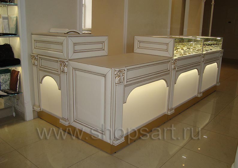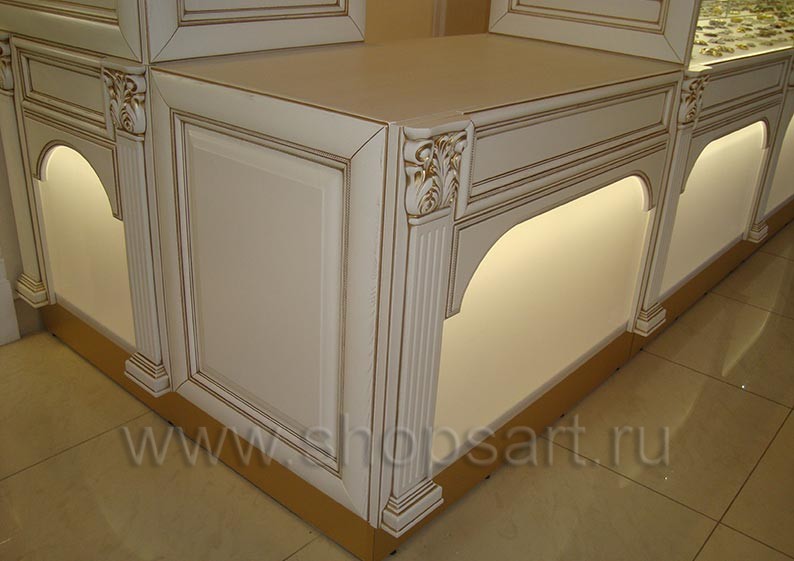 Наша компания занимается производством торгового оборудования. Мы изготовили функциональное оснащение для многих объектов, реализующих товары различных видов. Компания совершенствует свою продукцию, и каждая новая коллекция – яркое тому подтверждение. Представляем вашему вниманию мебель серии «ЭЛИТ ГОЛД». Это классика в лучших традициях. Торговые конструкции отличают строгие и в то же время гармоничные формы, лаконичный стиль. В сочетании с пастельными тонами и декоративными элементами, такими как арочные детали, карнизы и пилястры, строгость линий приобретает особый шик и презентабельность. Привлекательности и изысканности коллекции добавляют фасады, на которых выполнено патинирование золотом. Основным материалом производства служит высококачественный ЛДСП. В качестве сырья для изготовления лицевых деталей, стилизованных под дерево, используется МДФ, а также шпон натурального дерева.