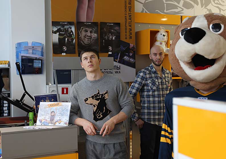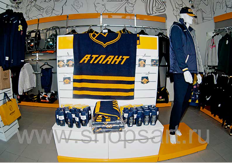 На этой странице Вы можете ознакомиться с фотографиями торгового оборудования в открытом официальном магазине хоккейного клуба «Атлант», город Мытищи, улица Лётная, дом 17, Ледовый Дворец «Арена Мытищи», на основе коллекции торговой мебели «АТЛАНТ». Поставила в магазин оборудование для одежды: вешала для магазина одежды, стеллажи для магазина одежды, стойки для магазина одежды, шкафы для магазина одежды, острова для магазина одежды компания «Искусство интерьеров». Узнать больше о наших коллекциях мебели для магазинов одежды вы можете на странице оборудование для одежды в Москве .