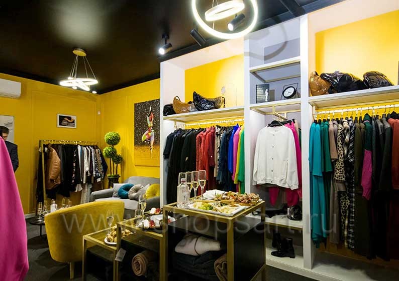 - Зеркала и мягкая мебель. Соответствующая торговая мебель необходима не только для размещения моделей одежды, но также для комфортной примерки. Большие зеркала позволят увидеть свой новый образ, а удобные кресла и банкетки точно не покажутся милым дамам лишними.
