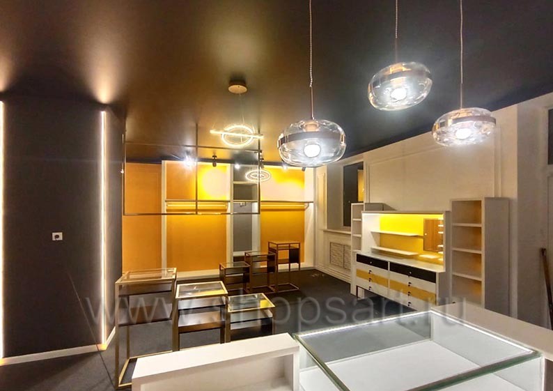 - Осветительные приборы. От интенсивности освещения в значительной мере зависит то, какое впечатление окажут на посетителей представленные модели одежды. Прожекторы и светильники способны акцентировать внимание клиентской аудитории на изделиях, негласно призывая купить их. Очень часто такой приём срабатывает – покупатели покидают магазин уже с пакетами.