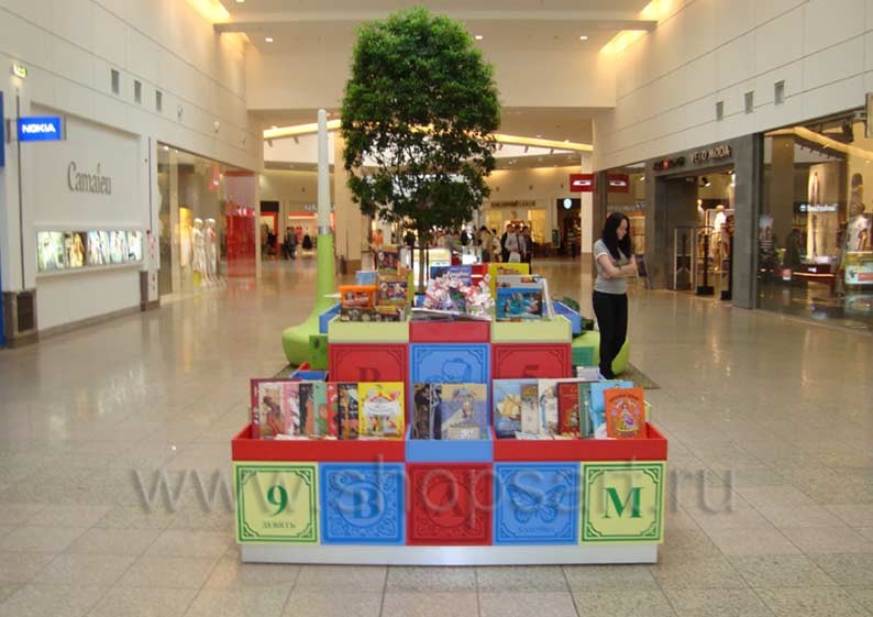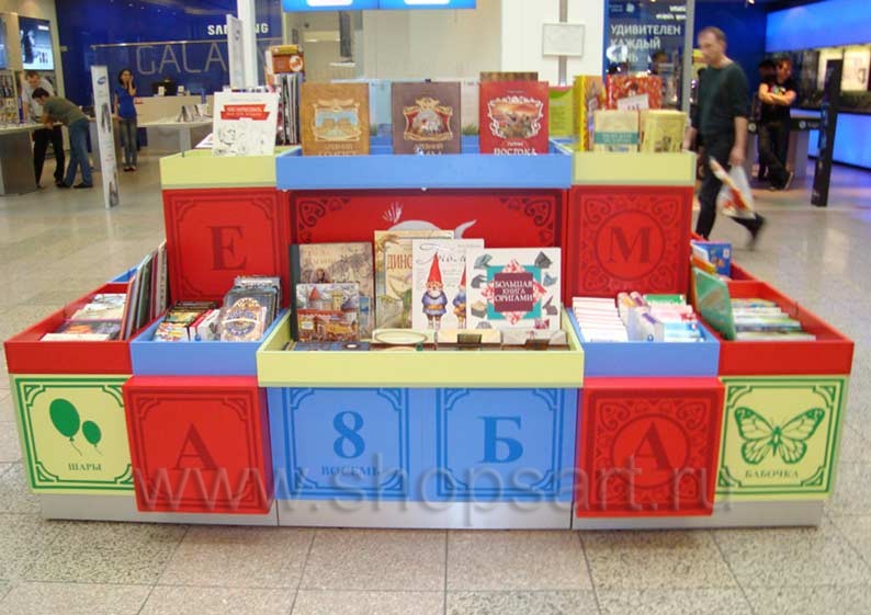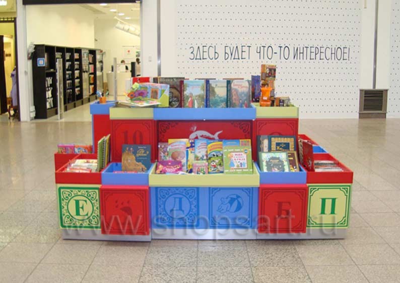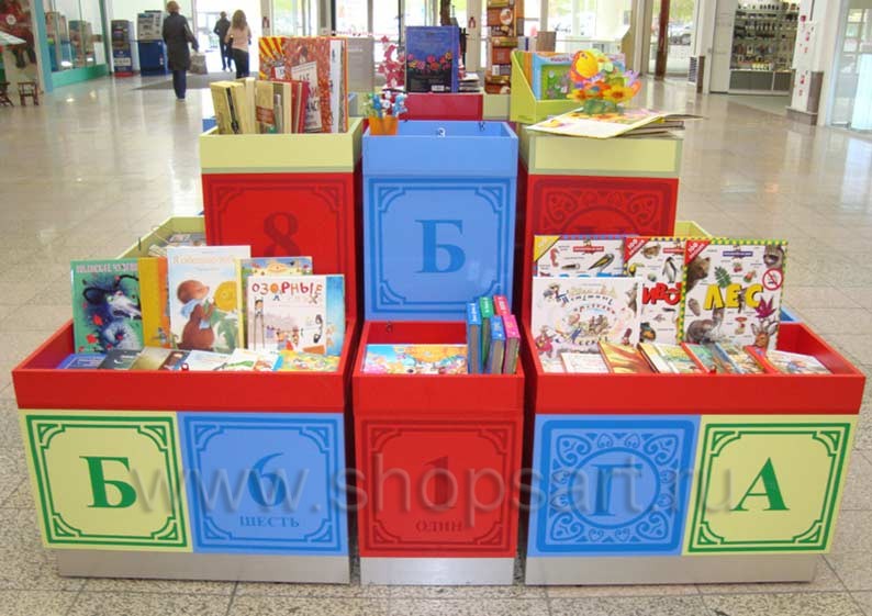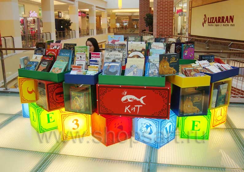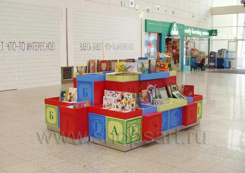 Торговое оборудование для продажи книг. Мы производим небольшие яркие островные конструкции для торговли книгами. Яркое цветовое пятно посередине торгового центра всегда привлечет к себе внимание. Незамысловатые формы, составленные в виде кубиков, выполненных с изображением букв и детских игрушек, обратит на себя внимание не только родителей, но и детей.