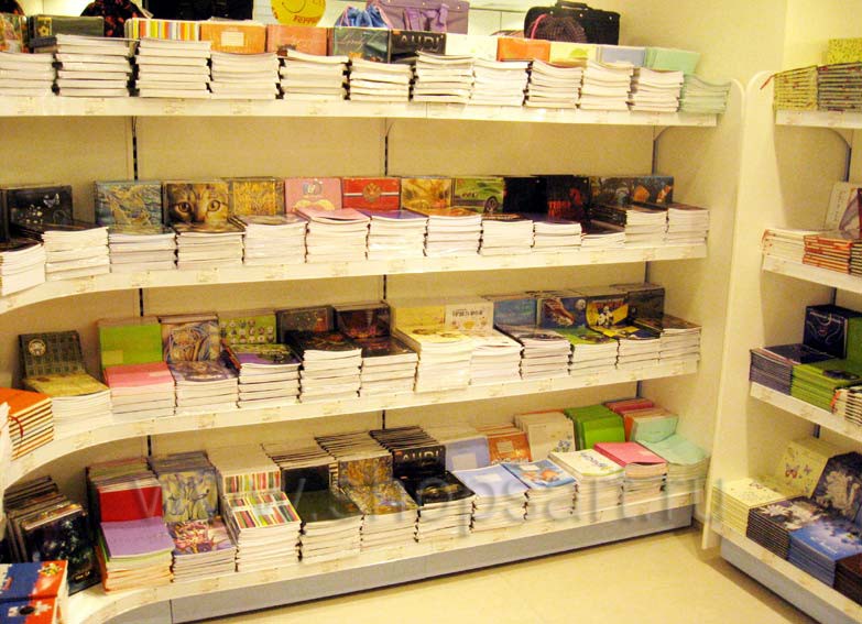 Для магазина использовались блоки пристенных стеллажей с регулируемыми по высоте полками и островные стеллажи закругленной формы, а также подиумы для демонстрации отдельных товаров. Зонирование помещения выполнялось при помощи островных групп.