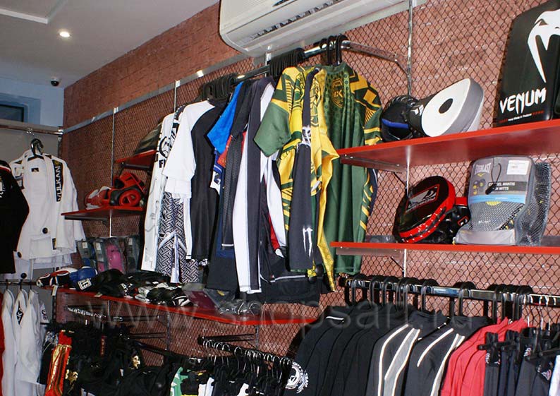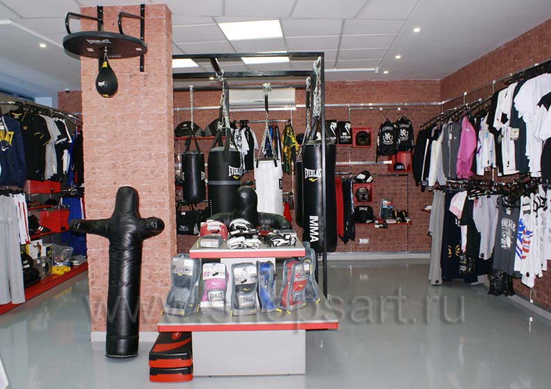 Торговые прилавки и стеллажи очень удобно применять для размещения спортивной формы и обуви. Если в магазине продается спортивное питание, то для его презентации лучше применять закрытые стеклянные витрины. Это позволит ограничить доступ посетителей к продукции. Достаточно, если продавец-консультант сам предложит оптимальный вариант покупателю из имеющегося на витрине ассортимента.