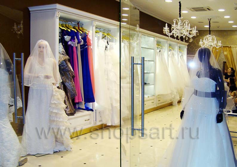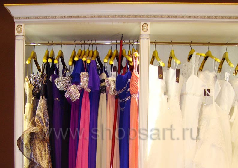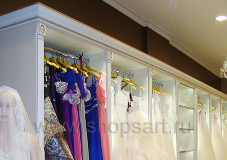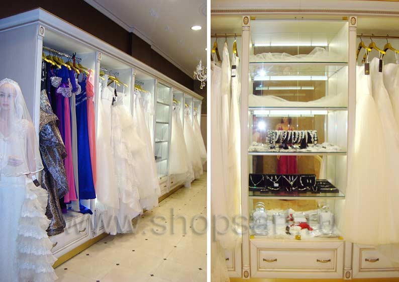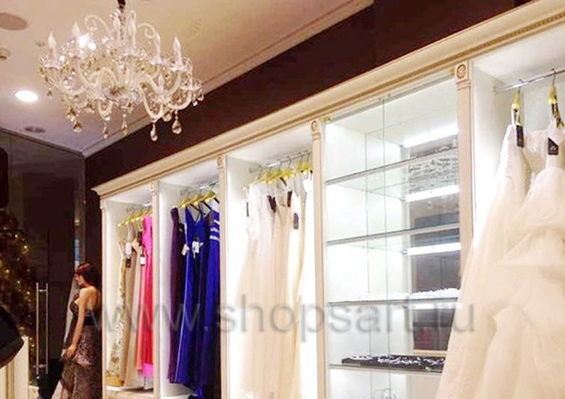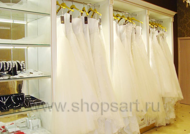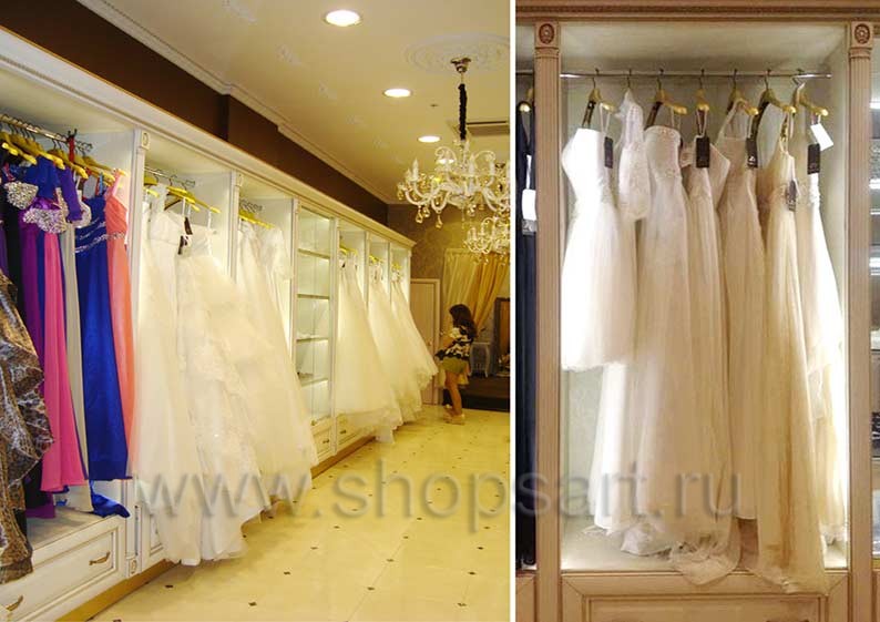 Посмотрите на фото магазинов одежды, размещенные на сайте компании ООО «Искусство интерьеров». Любая из представленных коллекций мебели отлично подойдет для оснащения свадебного салона. Это универсальное оборудование для одежды. Его можно использовать не только для демонстрации изделий повседневного гардероба, но также для презентации свадебных нарядов. Изящный декор торговых конструкций и пастельные тона сделают атмосферу салона нежной и романтичной.