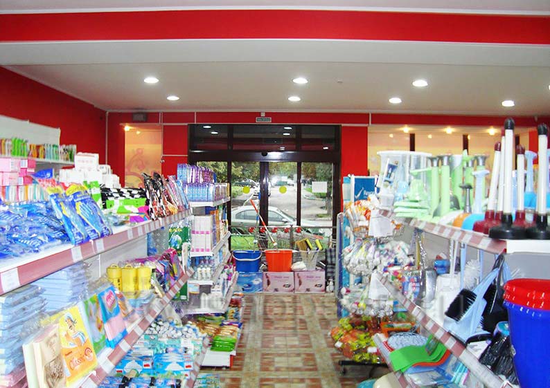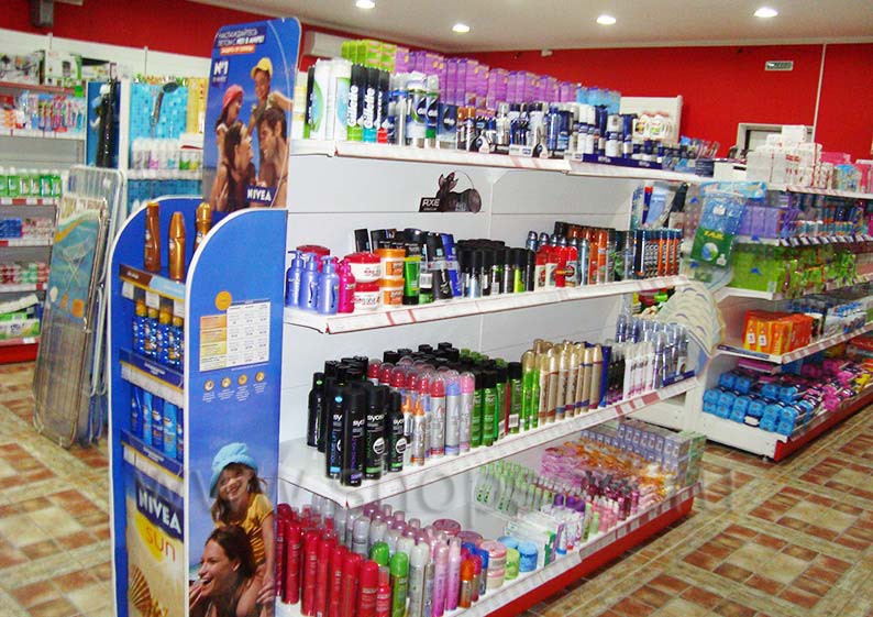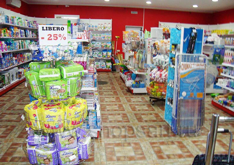 При оформлении этого торгового объекта использовались стеллажи нескольких типов – пристенные, островные, перфорированы. Дополнительно в торговом зале были установлены круговые стойки для импульсивных товаров. Все металлические конструкции решено было окрасить в белый цвет, что создало выгодный контраст с яркими стенами магазина.
