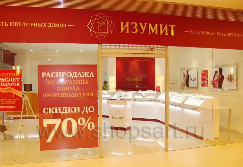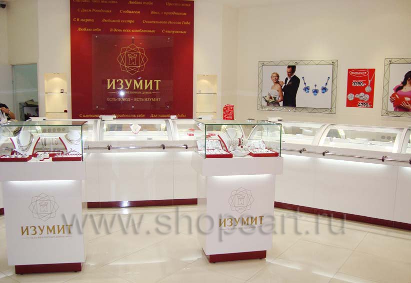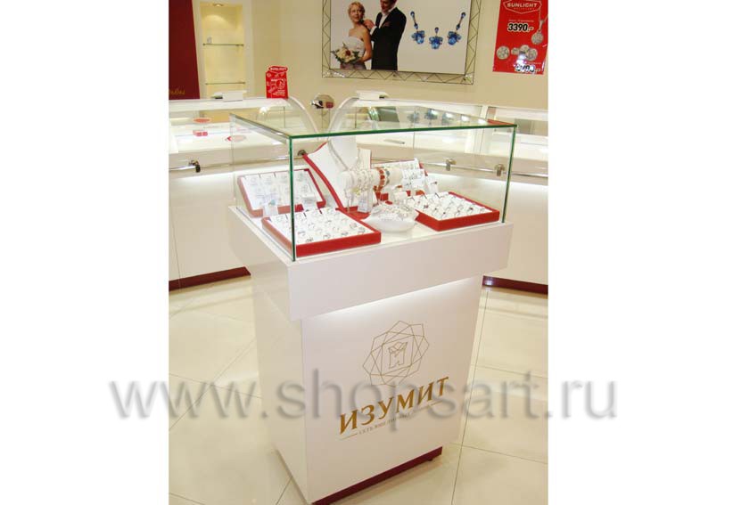 На этой странице Вы можете ознакомиться с фотографиями торгового оборудования в открытом ювелирном магазине «Изумит», находящемся в ТЦ “Конкорд-Маркет”, город Москва, улица Шаболовка. Торговую мебель: ювелирные витрины, витрины стеклянные кубы, ювелирные прилавки и ювелирные горки для магазина, на основе коллекции «ЭТАЛОН», поставила компания «Искусство интерьеров». Узнать больше о наших коллекциях мебели для магазинов Вы можете на странице торгового оборудования для ювелирных магазинов.