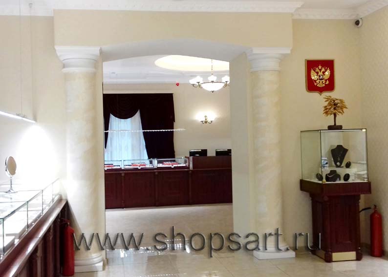 Дизайн интерьера ювелирного магазина “Октябрь”, г. Москва, Фрунзенская набережная, на основе коллекции торгового оборудования «КОРИЧНЕВАЯ КЛАССИКА»