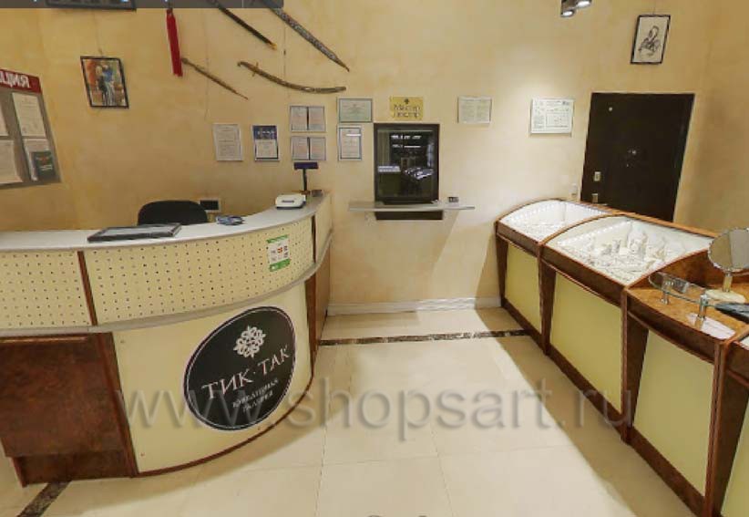 На этой странице Вы можете ознакомиться с фотографиями торгового оборудования в открытом ювелирном магазине-ломбарде часов и украшений «Тик-Так», находящемся в городе Москве, Комсомольский проспект. Торговую мебель: ювелирные витрины, ювелирные прилавки и ювелирные шкафы для магазина, на основе коллекции «ЭТАЛОН», поставила компания «Искусство интерьеров». Узнать больше о наших коллекциях мебели для магазинов Вы можете на странице торгового оборудования для ювелирных магазинов.