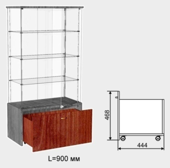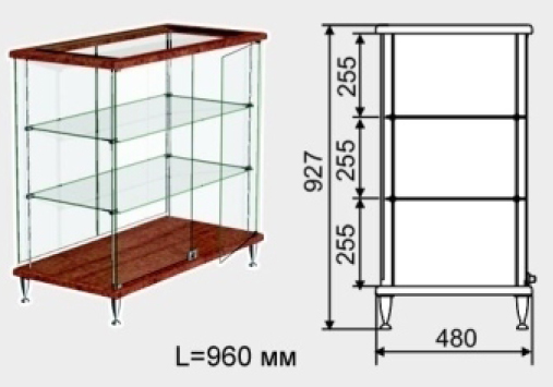 - И-011. Демонстрационный прилавок — столешница МДФ и стекло Стеклянная распашная дверь с замком Подсветки нет