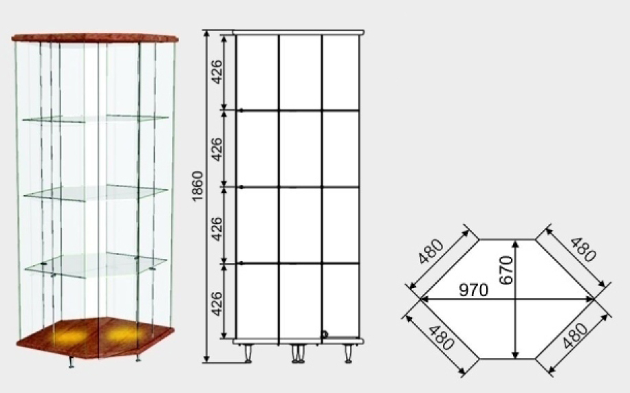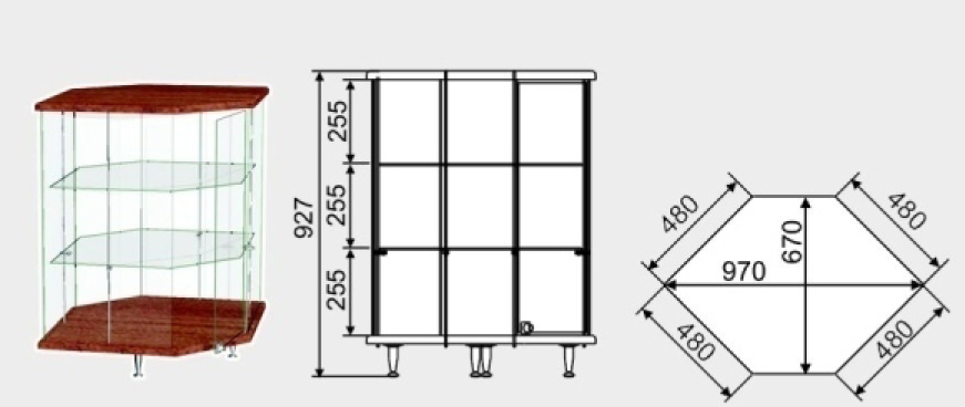 - И-015. Демонстрационный угловой (универсальный угол 90°) прилавок — столешница МДФ Стеклянная распашная дверь с замком Подсветки нет