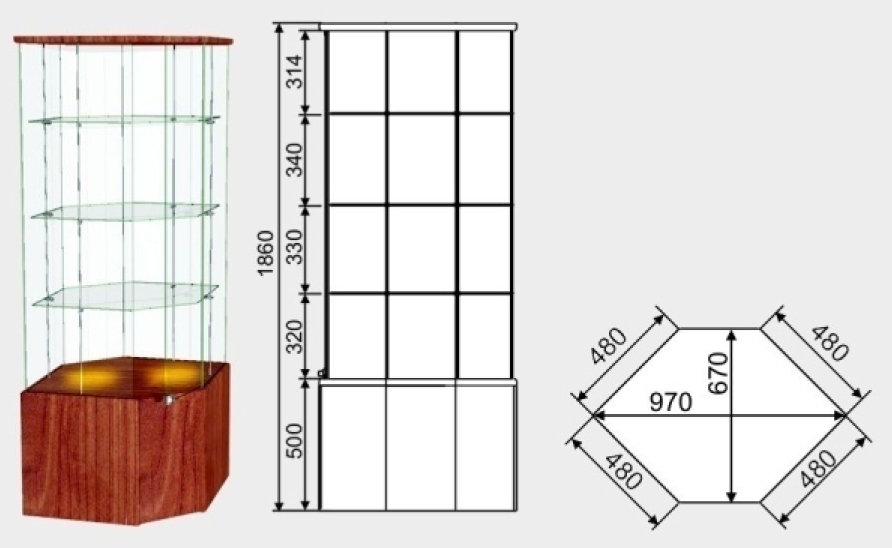 - И-014. Демонстрационный угловой (универсальный угол 90°) прилавок — столешница МДФ Стеклянная распашная дверь с замком Подсветки нет