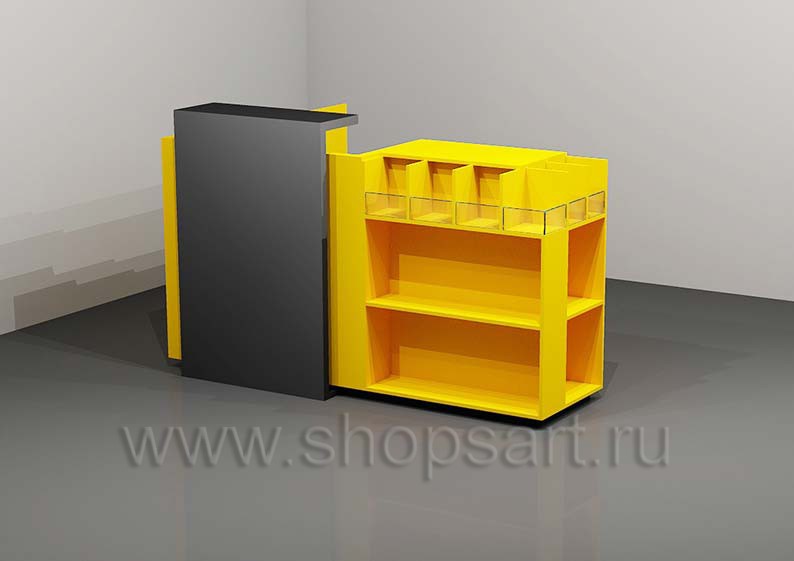 Кассовый стол с торговым прилавком для выкладки сопутствующего товара и декоративной накладкой. Прилавок имеет ячейки и открытые полки. Цвет желтый, черный, или любой другой по выбору Заказчика.