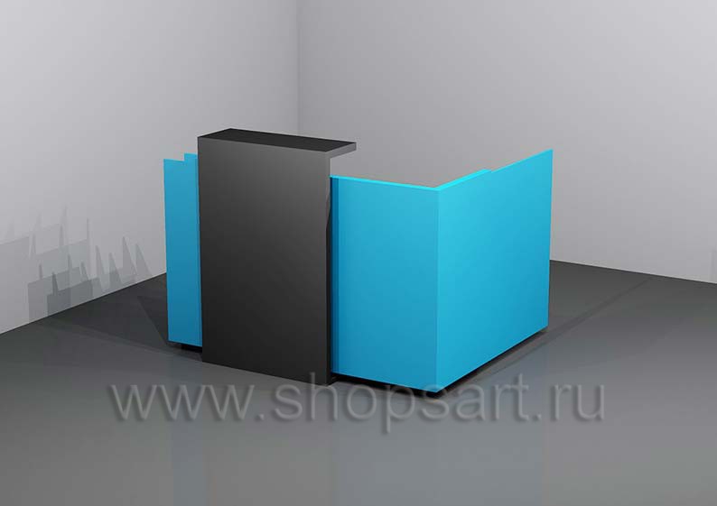 Стол кассовый с боковой перегородкой, может использоваться как угловой или для закрытого доступа с одной стороны. Содержит декоративную накладку с лицевой стороны. Цвет голубой, черный, или любой другой.