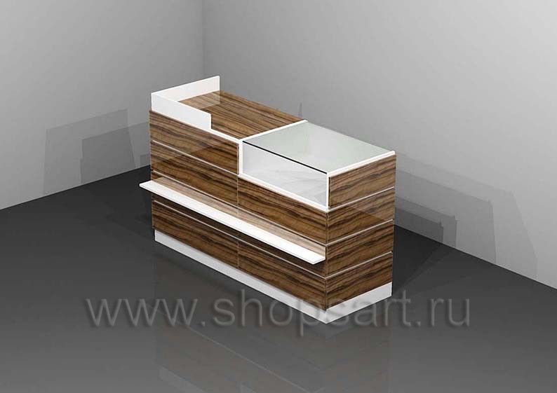 Кассовая зона на одно и более мест кассира, кассовые аппараты и мониторы ставятся на нижней столешнице. Фасад стола отделывается декоративной раскладкой. Материал: ЛДСП, массив дерева, тонируемый в любой цвет.