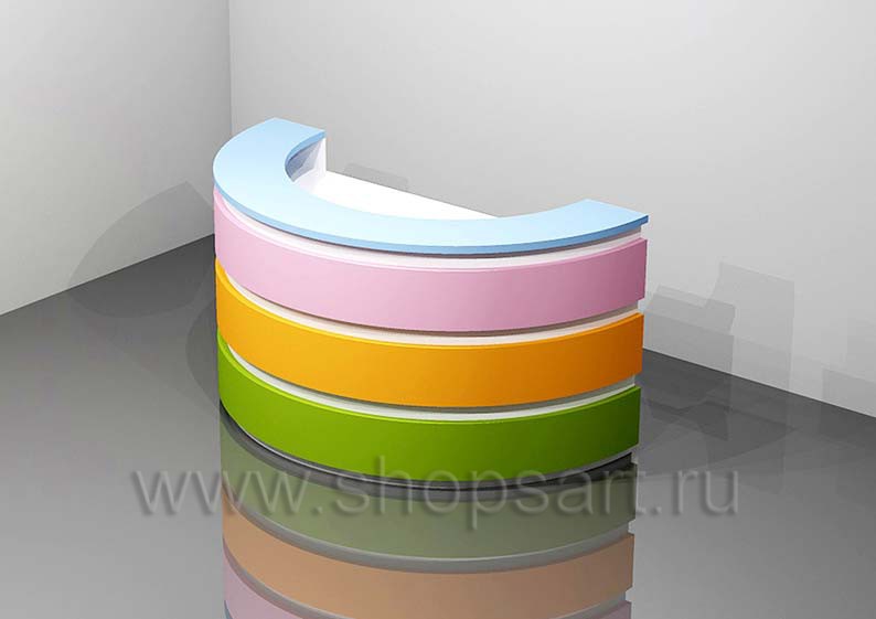 Радиусная стойка может использоваться как стойка ресепшен, стойка администратора кассовый узел. В изделии используется окрашенный МДФ, ЛДСП. Цвет отделки ресепшена может быть любым, в соответствии с фирменным стилем и дизайном Вашего магазина. Отлично подойдет для детских торгово-развлекательных зон.