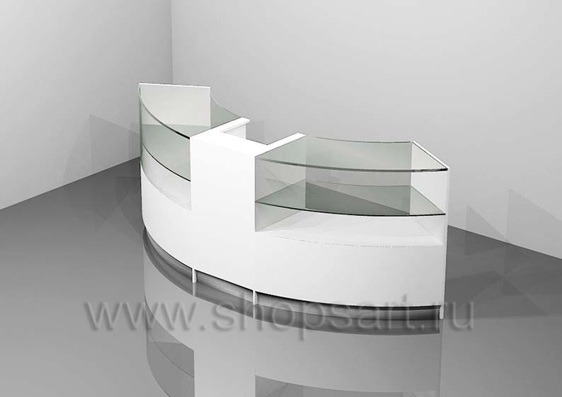 Радиусная кассовая зона состоит из кассового узла и двух стеклянных, двухуровневых прилавков, с радиусными стеклами для выкладки украшений и аксессуаров, расположенных по бокам изделия. Кассовая зона выполнена из окрашенного в белый цвет МДФ, белого ЛДСП, стекла 8мм.