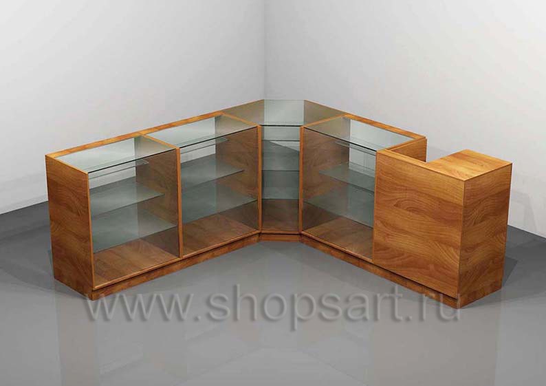 Кассовый стол в линии прилавков, угловой. Кассовая зона в сочетании с прилавками для продажи мелкого товара. Кассовый узел выполнен из ЛДСП Орех, стекла 6мм. Фасад и полки прилавков выполнены из стекла. По желанию Заказчика прилавки могут быть оснащены светодиодной подсветкой.