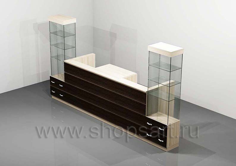 Кассовый узел состоит из кассового стола по бокам которого монтируются стеклянные витрины для выкладки товара. За кассовым блоком может быть смонтирована панель, на которую будет нанесено название и логотип Вашего магазина. Цвет ЛДСП – Венге, Клен.