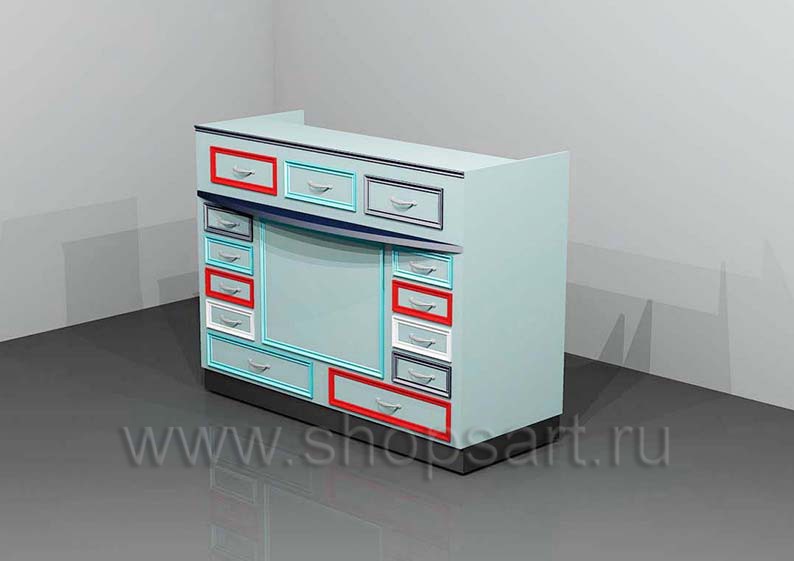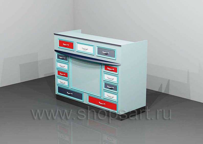 Стол под кассу, с имитацией ящиков и ручек. Создаст яркий образ для любого магазина. Материал: голубой ЛДСП, рамки — массив дерева тонируемый в любой цвет.