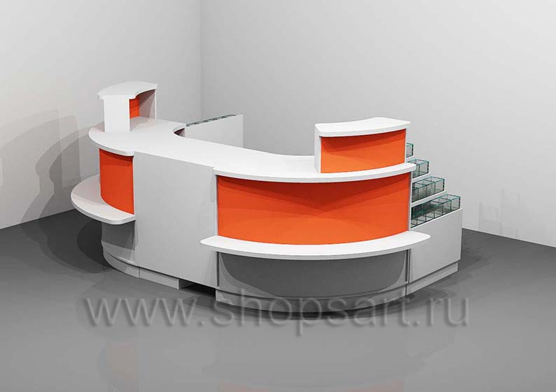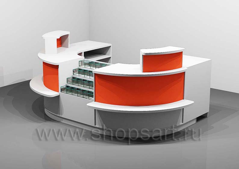 Радиусный кассовый блок состоит двух рабочих мест для работы кассиров, бокового прилавка и зоны упаковки товара. Прилавок используется для демонстрации сопутствующего мелкого товара в стеклянных ячейках. Материал: стекло 6 мм., оранжевый и серый ЛДСП, или другой, соответствующий дизайну торговой точки.