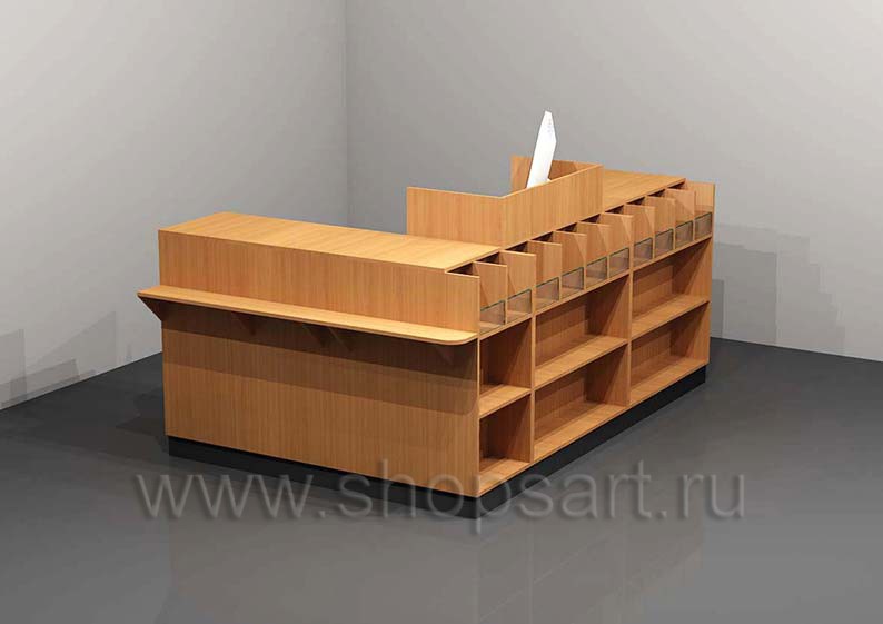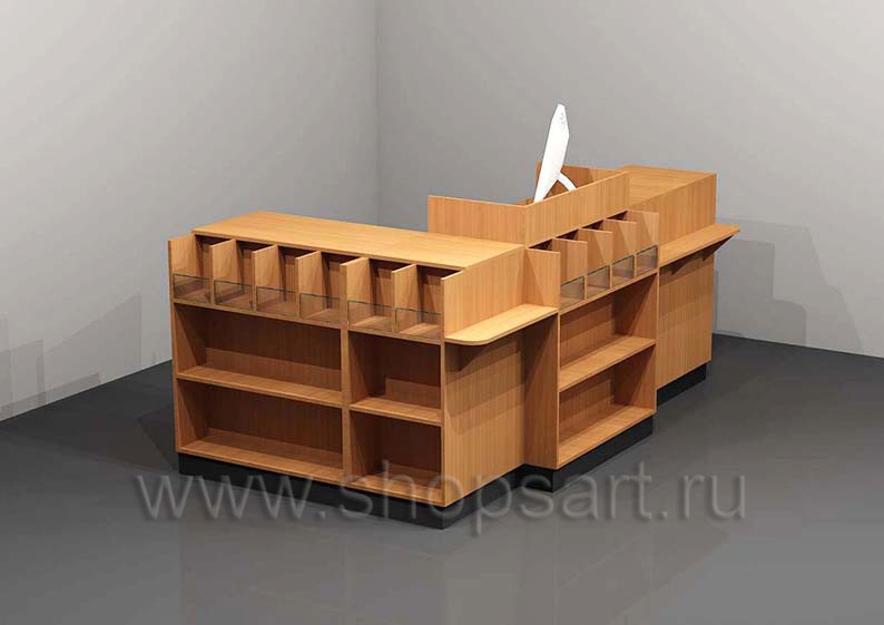 Стойка под кассу на одно и более мест кассира, кассовые аппараты и мониторы ставятся на нижней столешнице. По передней части стойки устанавливается бортик для сумок. Материал: ЛДСП, массив дерева, тонируемый в любой цвет.