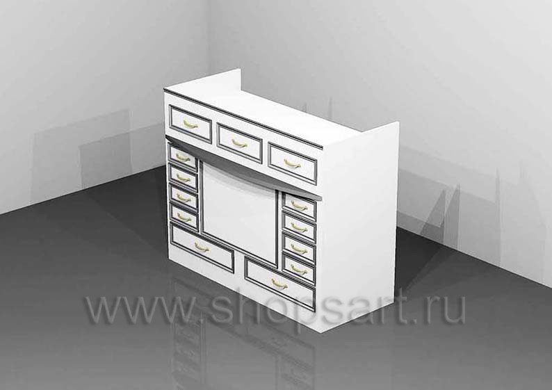 Стол демонстрационный для магазина, с выдвижными ящиками и прилавком со стеклянной крышкой. Материал: ЛДСП, массив дерева тонируемый в любой цвет. Стол используется в ювелирных магазинах и магазинах часов.