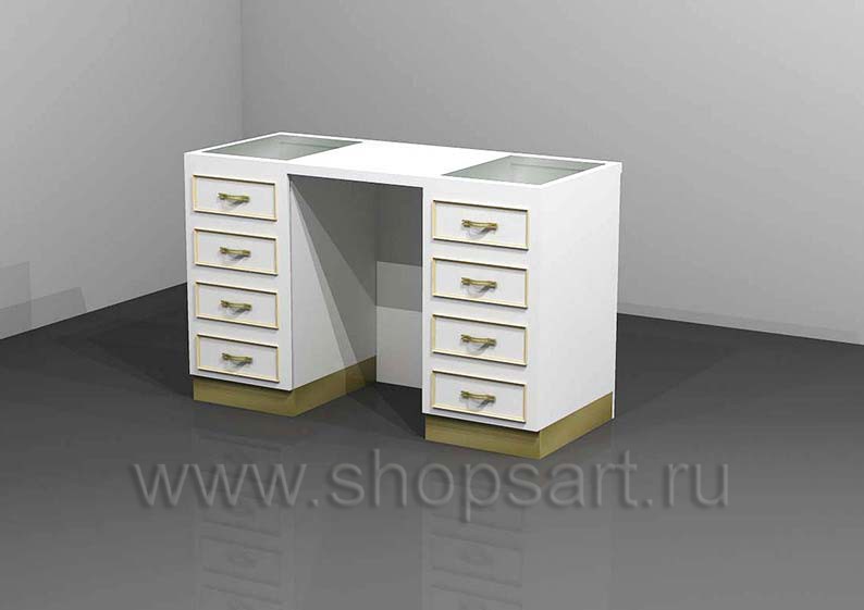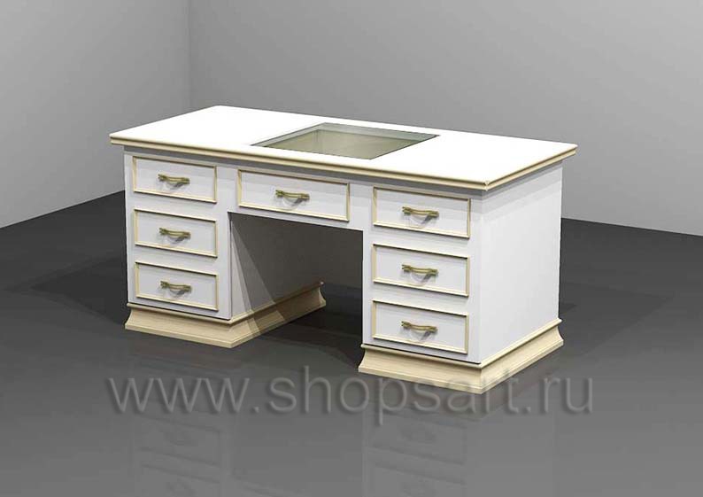 Стол демонстрационный, с выдвижными ящиками и прилавками, имеющими стеклянный верх. Материал: ЛДСП, массив дерева которое тонируется в любой цвет. Стол используется для демонстрации украшений и аксессуаров.