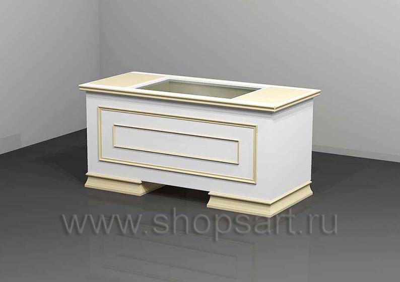 Торговый демонстрационный стол с прилавком, имеющим стеклянный верх. Материал: ЛДСП, массив дерева которое тонируется в любой цвет. Стол отлично подойдет для ювелирных магазинов и магазинов часов.