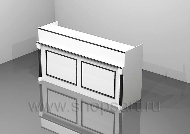 Кассовый узел на одно и более мест кассира, кассовые аппараты и мониторы ставятся на нижней столешнице. Стол выполнен в классическом стиле, по бокам располагаются колонны из массива дерева. Материал: ЛДСП, массив дерева, тонируемый в любой цвет.