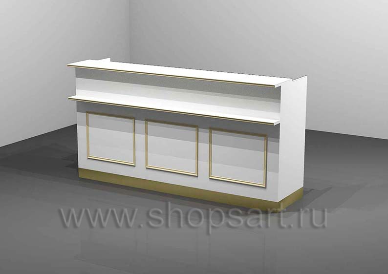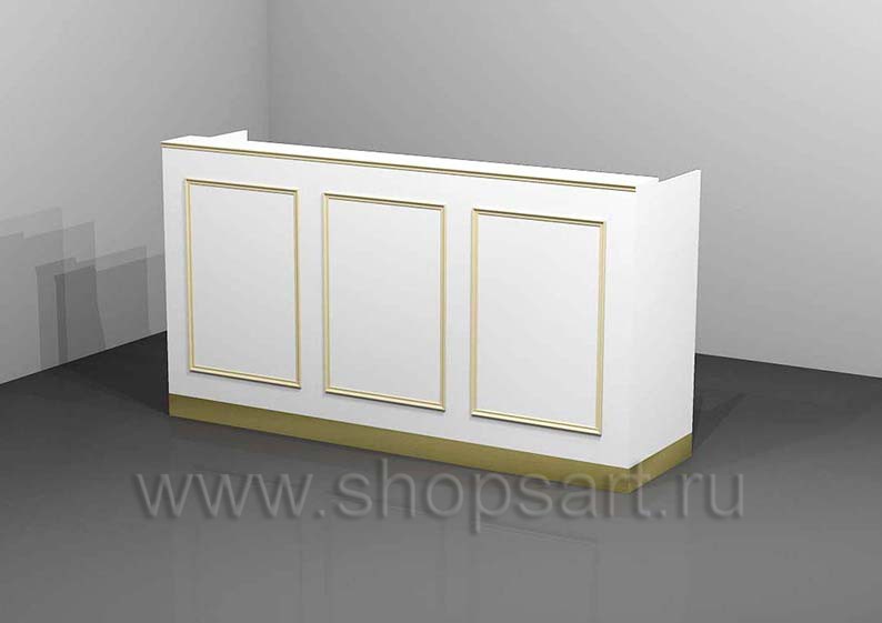 Стол под кассу на одно и более мест кассира, кассовые аппараты и мониторы ставятся на нижней столешнице. Передней часть стола декорируется золотыми раскладками из массива дерева. Материал: ЛДСП, массив дерева, тонируемый в любой цвет.