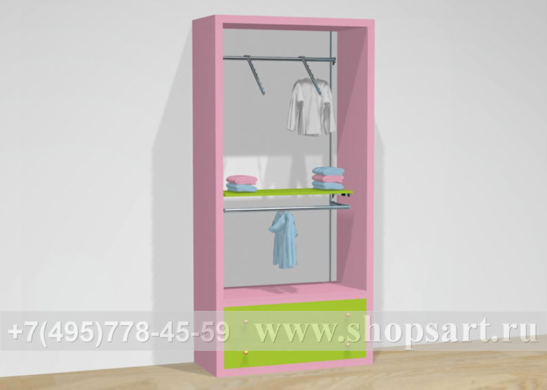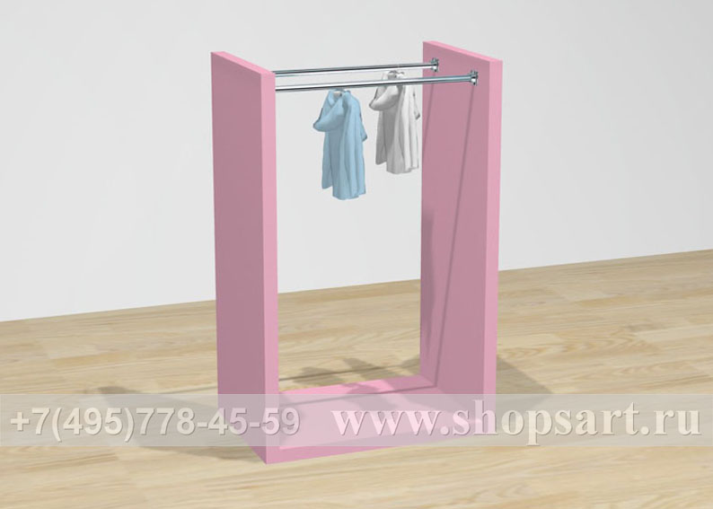 Стойка имеет две штанги для большего количества вывешиваемой одежды. На боковые стенки могут наноситься картинки с изображением бренда вывешенного товара. Стойка производится из ЛДСП, металлической трубы d 25 мм. Может размещаться в центре торгового зала. Стойка привлекает внимание покупателей своим оригинальным дизайном, удобна для навески одежды.