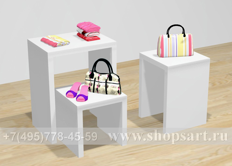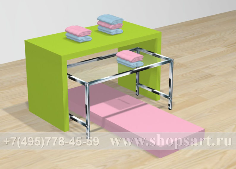 Островные столики производятся из ЛДСП. Столики удобны для выкладки и просмотра одежды, обуви, аксессуаров. Используются для выкладки товара в центре зала и оформлении витрин.
