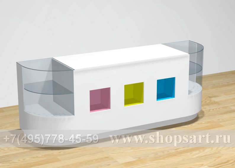 Стол производится из ЛДСП, стекла 8 мм. Ниши в столе могут быть с подсветкой и служить элементом декорирования кассового стола. Радиусные витрины могут использоваться как для выкладки товара, так и для декорирования кассового стола.