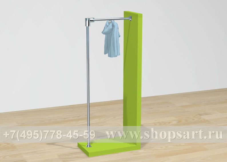 Стойка производится из ЛДСП, металлической трубы d 25 мм. Может размещаться в центре торгового зала. Стойка привлекает внимание покупателей своим оригинальным дизайном, удобна для навески одежды.