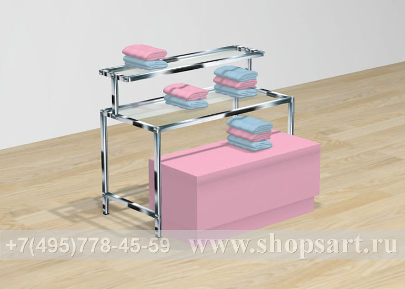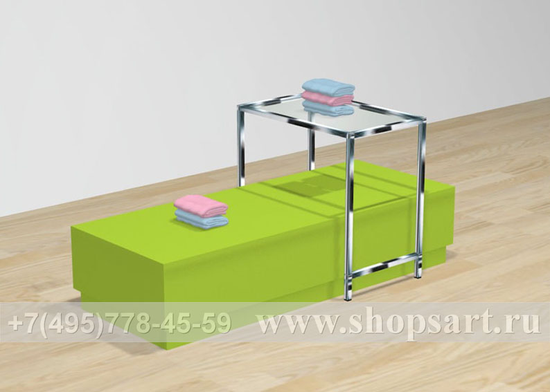 Островная конструкция производится из ЛДСП, стекла 8мм. и металлической трубы 20х20мм. Благодаря оригинальному дизайну, гармонично сочетающему хромированный металл, стекло и цветовому решению стола и подиума, остров привлекает внимание покупателей. Островная конструкция удобна для выкладки и просмотра одежды, обуви, аксессуаров. Используется для выкладки товара в центре зала и оформления витрин.