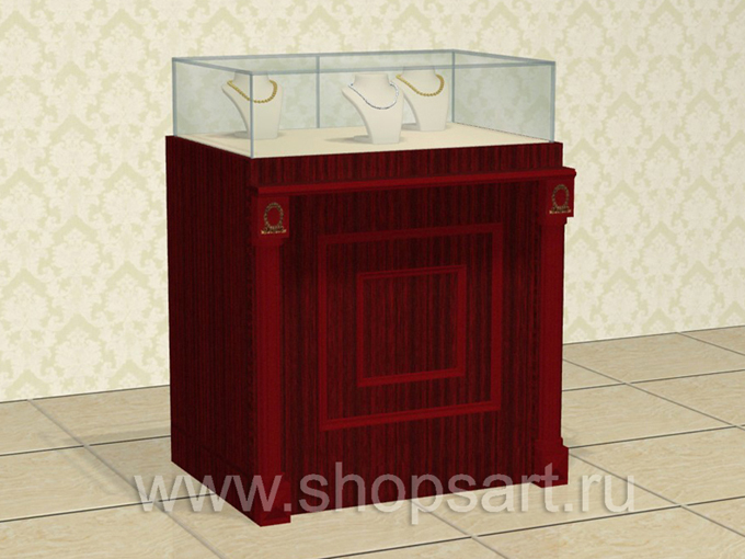 Линия ювелирных прилавков в сочетании с высокими кубами, изготавливаются из ЛДСП, с декоративными элементами из массива дуба. Стеклянный колпак из стекла 8мм., склейка УФ, дверки распашные. Золотая фурнитура (замки и петли). Высота 1100мм., ширина 800мм., глубина 582мм., козырек 70мм. На все прилавки устанавливается мастер ключ. Ножки регулируемые. Цоколь — металлизированный пластик.