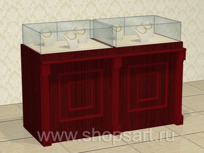 - Прилавок двойной торговый ювелирный. Прилавок двойной, торговый, изготавливается из ЛДСП, с декоративными элементами из массива дуба. Стеклянный колпак из стекла 8мм., склейка УФ, дверки распашные, золотая фурнитура (замки и петли). Высота 1100мм., ширина 800мм., глубина 582мм., козырек 70мм. На все прилавки устанавливается мастер ключ. Ножки регулируемые. Цоколь — металлизированный пластик.