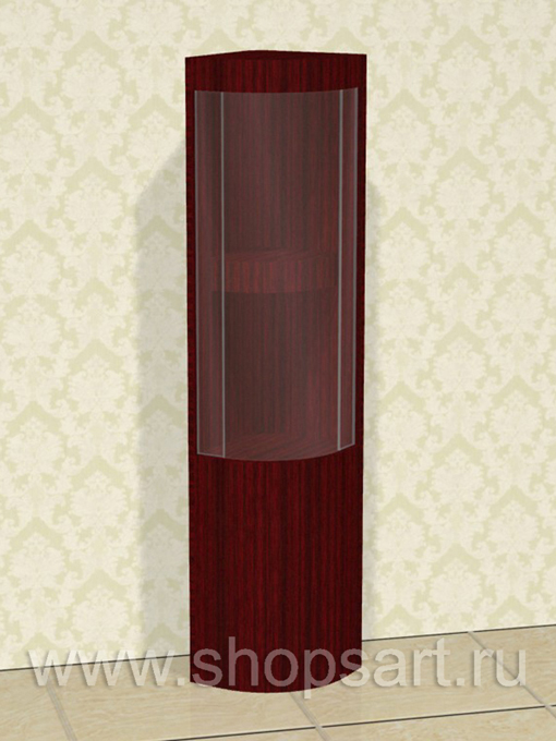 Витрина угловая, радиусная, изготавливается из ЛДСП, с малированным (гнутым) стеклом. Полки ЛДСП, пластик, дверки стеклянные распашные, гнутые. Золотая фурнитура (замки и петли). Габаритные размеры: высота 2114мм., ширина 300мм., глубина 300мм. Ножки регулируемые. Цоколь махагон. Две декоративные колонны с элементами массива дуба, карниз.