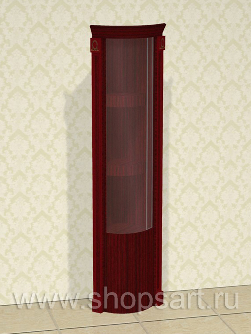 Витрина угловая, радиусная, изготавливается из ЛДСП, с малированным (гнутым) стеклом. Полки ЛДСП, пластик, дверки стеклянные, распашные, гнутые. Золотая фурнитура (замки и петли). Габаритные размеры: высота 2114мм., ширина 300мм., глубина 300мм. Ножки регулируемые. Цоколь махагон. Две декоративные колонны с элементами массива дуба, карниз.