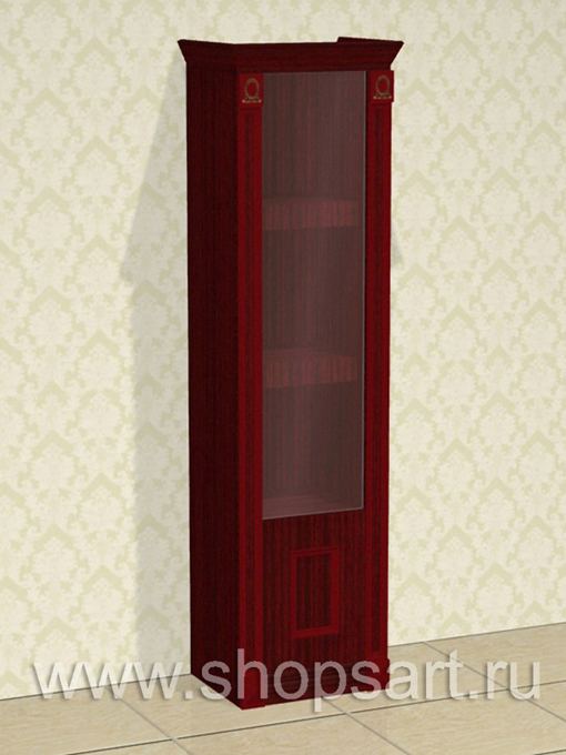 Шкаф для показа ювелирных украшений. Изготавливается из ЛДСП. Под полками устанавливается светодиодная подсветка, дверки стеклянные, распашные. Золотая фурнитура (замки и петли). Высота 2114мм., ширина 590мм., глубина 300мм. Ножки регулируемые. Цоколь из массива дерева. В верхней части витрины устанавливается декоративный карниз.