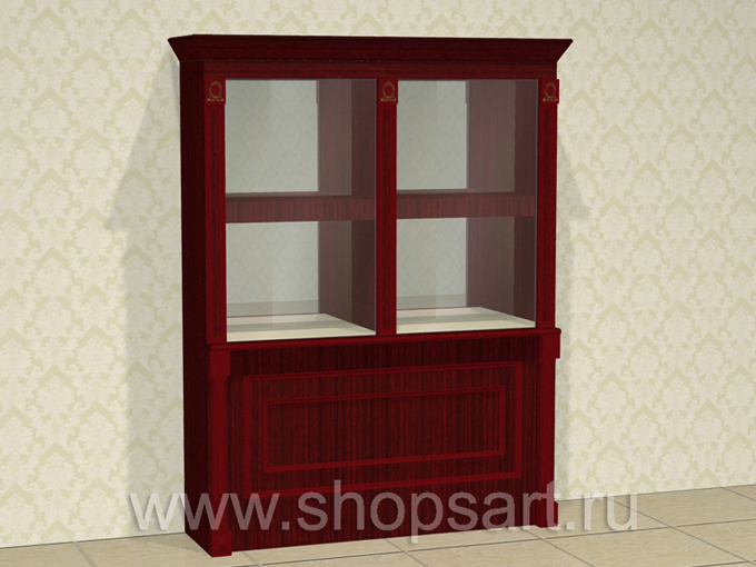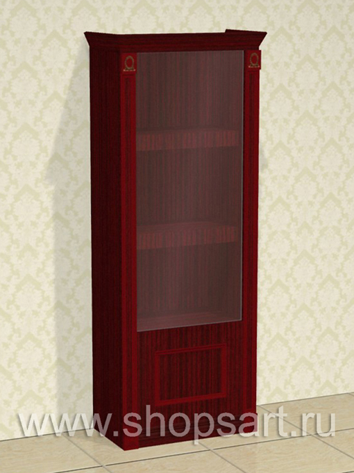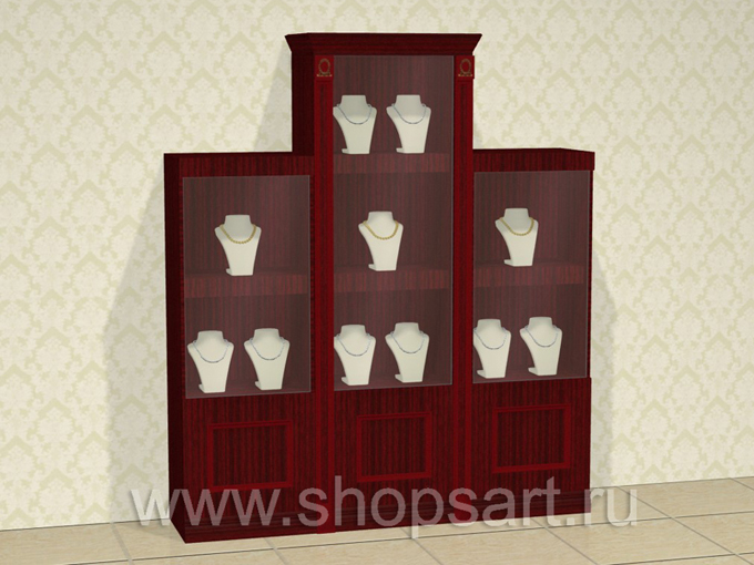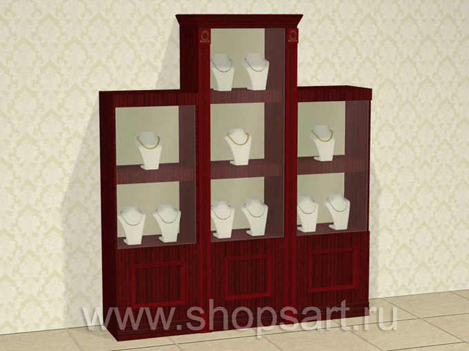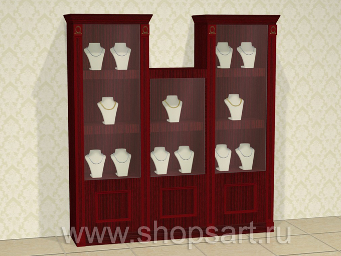 Шкафы для демонстрации ювелирных украшений, изготавливается из ЛДСП. Под полками устанавливается светодиодная подсветка, дверки, стеклянные распашные. Золотая фурнитура (замки и петли). Высота 2114мм. и 1600мм., ширина 590мм., глубина 300мм. Ножки регулируемые. Цоколь — массив дерева. В верхней части витрины устанавливается декоративный карниз.