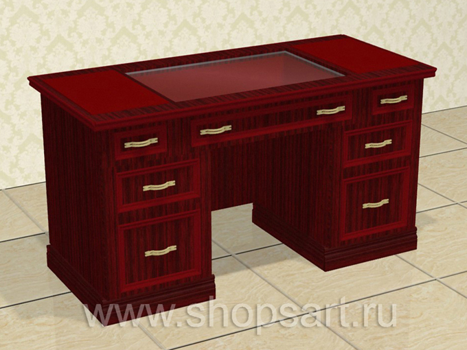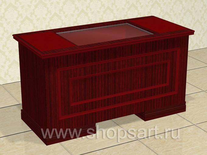 Стол демонстрационный для показа часов, изготавливается из ЛДСП, в верхней части стекло и выдвижной прилавок. Золотая фурнитура (замки и петли). Высота 850мм., ширина 600мм., глубина 1400мм. Ножки регулируемые. Цоколь — массив дерева.