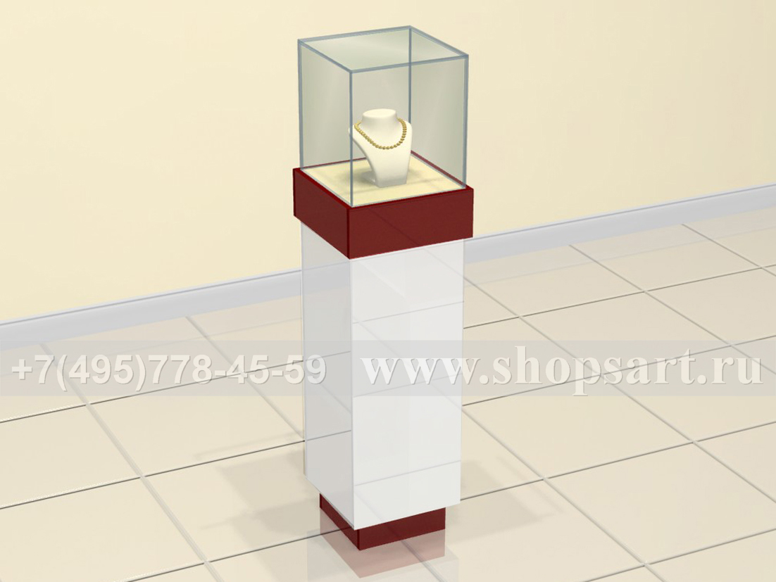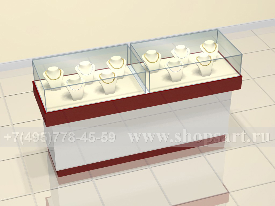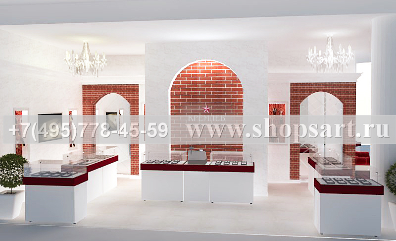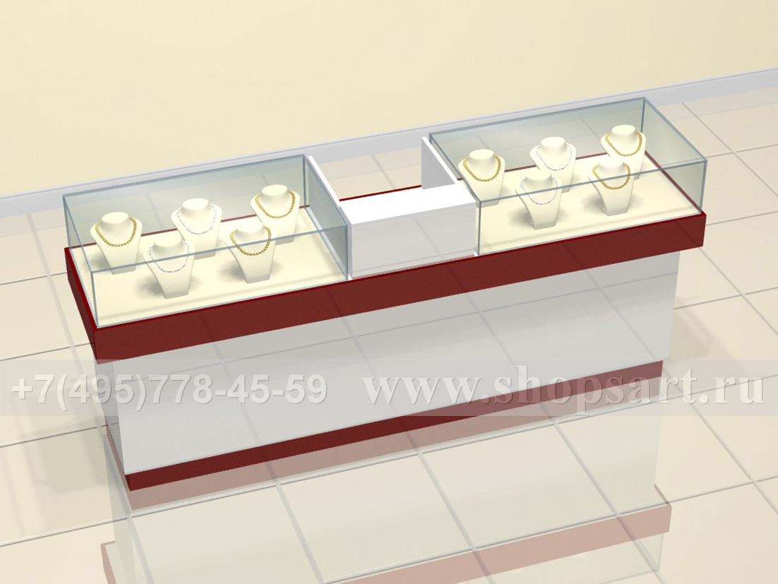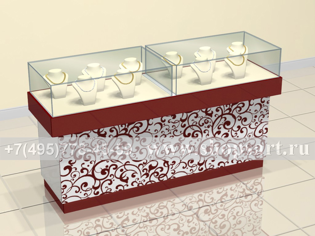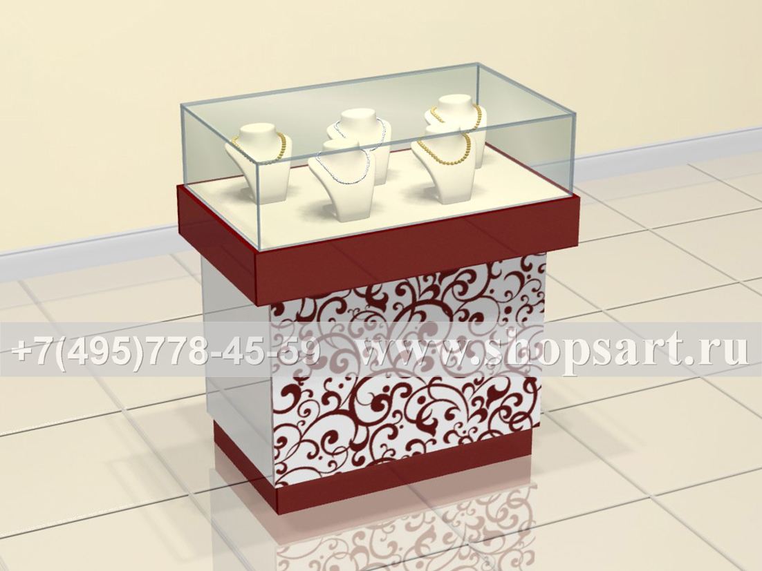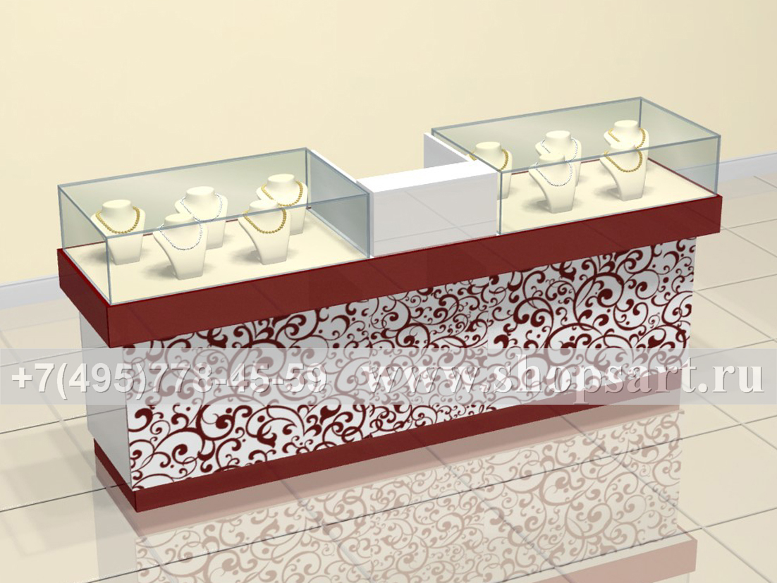 Торговое оборудование выполняется из высокоглянцевого МДФ бордового цвета и матового белого ЛДСП. Стекло 8мм., колпак клееный, склейка стекла ультрафиолетом. Торговое оборудование на винтовых регулируемых ножках, с выдвижной кареткой на направляющих полного выдвижения. В нижней части имеются накопители с распашными дверками на замке. Фурнитура цвета хром. Внутри прилавков укладывается оргалит с поролоном обтянутый белым кожзамом. Подсветки прилавков осуществляется точечными светильниками на ножках, со светодиодными лампами. По передней части прилавков устанавливается декоративная подсветка светодиодами.