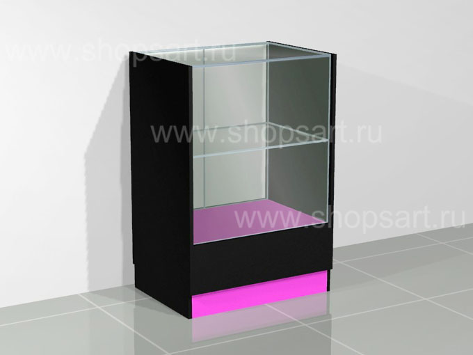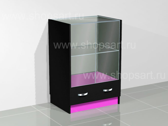 Прилавок предназначен для выкладки и демонстрации товара, имеет выдвижной ящик на направляющих полного выдвижения и стеклянные распашные дверки с замком. Цоколь покрыт пленкой ORACAL. Основание прилавка черный ЛДСП.