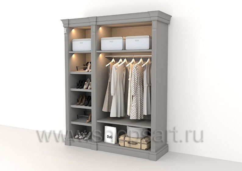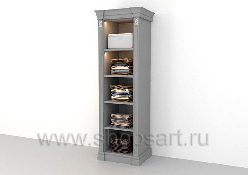 Шкаф для одежды имеет открытую конструкцию, оснащен верхней и нижней полками для хранения вещей. Для хранения одежды на плечиках установлена штанга. Изделие выполнено из матового ЛДСП светло-серого цвета. Шкаф для одежды оформлен в классическом стиле, имеет внутреннюю подсветку. Декоративная отделка колонны, карниз и цоколь изделия выполнены из массива дуба. Шкаф может быть выполнен в другом цвете материалов.